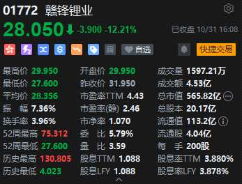 鋰礦股齊挫,贛鋒鋰業(yè)(002460)跌超12%。消息面上,贛鋒鋰業(yè)公布了前三季度的營(yíng)業(yè)收入256.82億元,同比減少6.99%;歸屬于上市公司股東的凈利潤(rùn)60.1億元,同比減少59.38%。