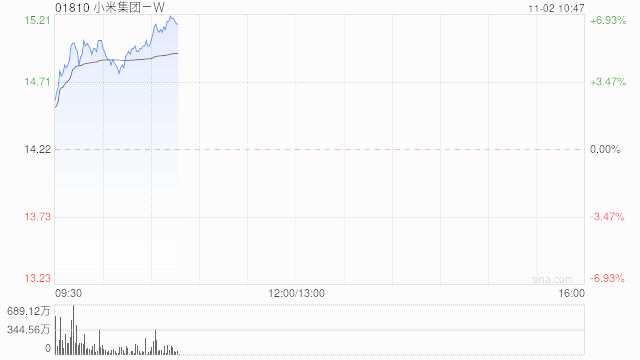 小米集團(tuán)-W(01810)早盤曾漲5.63%,高見15.04港元,創(chuàng)2022年3月底以來新高。股價(jià)現(xiàn)漲5.06%,報(bào)14.94港元,成交額11.69億港元。