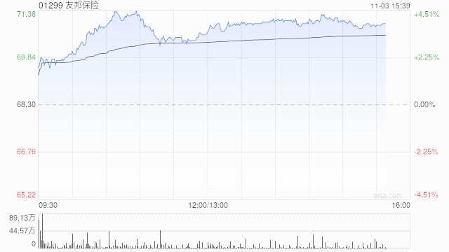 友邦保險(01299)午盤上漲3.81%,現(xiàn)報70.90港元,成交額15.08億港元。