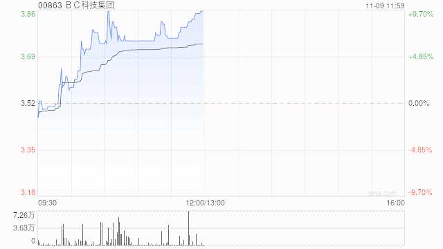 BC科技集團現(xiàn)漲近10% 大和將目標價由4.5港元上調至5.3港元