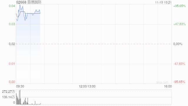 百德國際(02668)早盤股價向好,上漲78.26%,現(xiàn)報0.041港元,成交額95.38萬港元。