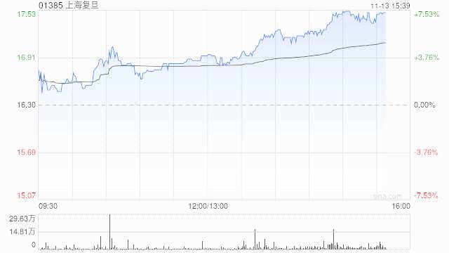 上海復(fù)旦(01385)午盤漲幅持續(xù)擴大,上漲6.87%,現(xiàn)報17.42港元,成交額7036.17萬港元。