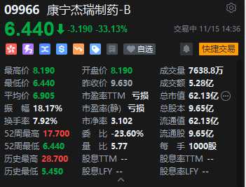 摘要: 11月15日消息,生物醫(yī)藥B類股午后跌幅持續(xù)擴大,截至發(fā)稿,康寧杰瑞制藥-B跌超33%,報6.44港元,總市值62.13億港元,成交額5.28億港元。該股連跌三日,累計跌幅超50%。