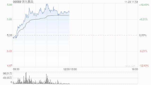 洪九果品(06689)早盤(pán)持續(xù)升高,上漲8.63%,現(xiàn)報(bào)5.79港元,成交額1.35億港元。