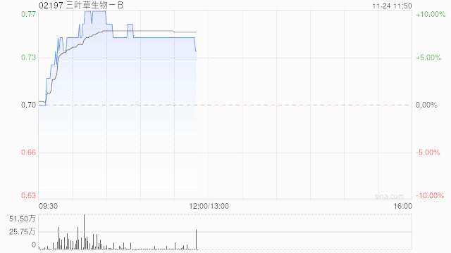 三葉草生物-B(02197)早盤上漲5.71%,現(xiàn)報0.74港元,成交額475.98萬港元。