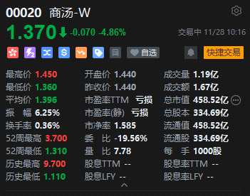 11月28日消息,商湯港股短線跳水,盤中一度跌超5%,截至發(fā)稿,跌4.86%,股價報1.37港元。