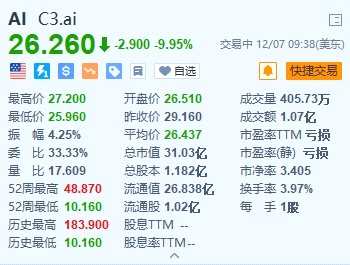 AI公司C3.ai(AI.US)跌近10%,報26.26美元。C3.ai第二財季營收7320萬美元,同比增長17%,不及市場預(yù)期的7400萬美元;凈虧損6978萬美元,上年同期虧損為6885萬美元。該公司指出,客戶設(shè)立的人工智能治理部門增加了審查流程,從而削弱了公司的收入。