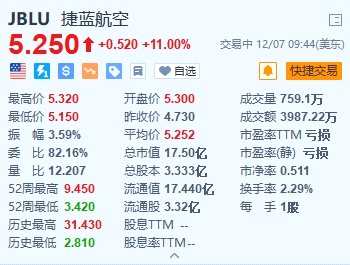 摘要: 來源:互聯(lián)網(wǎng)捷藍(lán)航空(JBLU.US)漲11%,報(bào)5.25美元。捷藍(lán)航空表示,自10月下旬以來,預(yù)訂量超出預(yù)期。該公司目前預(yù)計(jì)2023年調(diào)整后的每股虧損將在40美分到50美分之間,