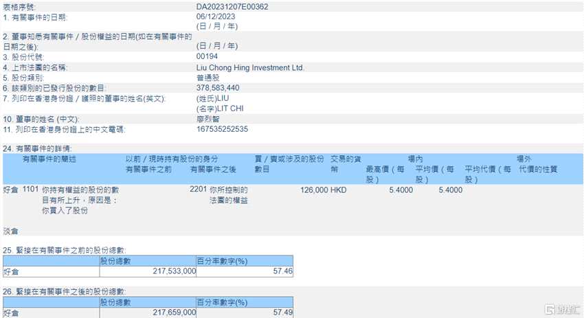 摘要: 來(lái)源:互聯(lián)網(wǎng)互聯(lián)網(wǎng)12月8日丨根據(jù)聯(lián)交所最新權(quán)益披露資料顯示,2023年12月6日,廖創(chuàng)興企業(yè)(00194.HK)獲執(zhí)行董事、董事會(huì)主席、行政總裁兼董事總經(jīng)理廖烈智在場(chǎng)內(nèi)以每股均價(jià)5.40港元增持12