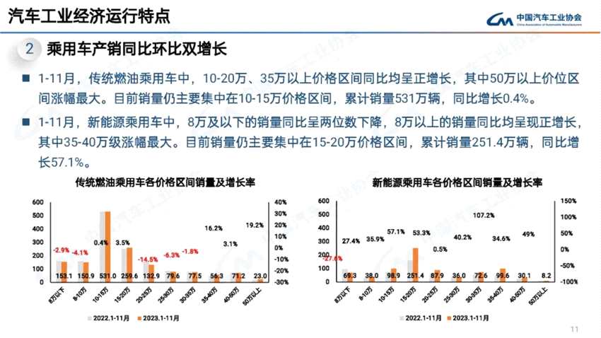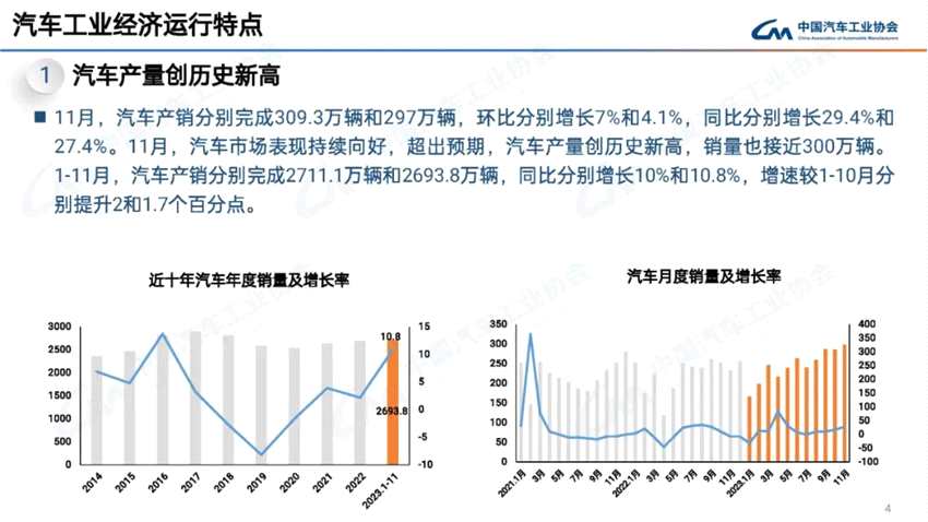 12月11日,中汽協(xié)最新數(shù)據(jù)顯示,11月,汽車產(chǎn)銷環(huán)比同比均實現(xiàn)增長,汽車產(chǎn)銷分別完成309.3萬輛和297萬輛,環(huán)比分別增長7%和4.1%,同比分別增長29.4%和27.4%。11月,汽車市場表現(xiàn)持續(xù)向好,超出預(yù)期,汽車產(chǎn)量創(chuàng)歷史新高,銷量也接近300萬輛。1-11月,汽車產(chǎn)銷分別完成2711.1萬輛和2693.8萬輛,同比分別增長10%和10.8%。