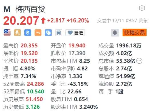 梅西百貨大漲超16% 消息稱其獲58億美元溢價私有化收購要約