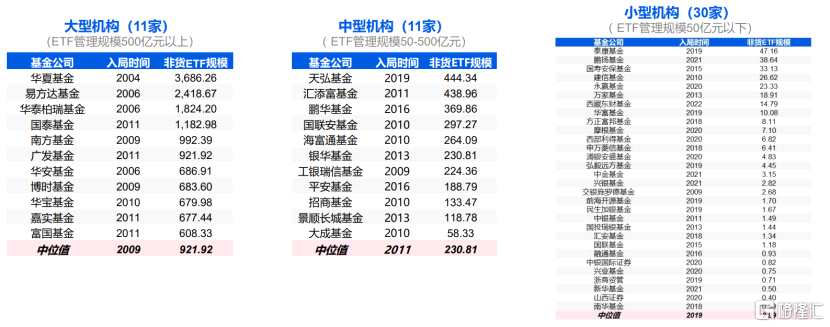 機(jī)構(gòu)格局上,當(dāng)前ETF市場(chǎng)共有52家機(jī)構(gòu)參與,規(guī)模500億元以上的機(jī)構(gòu)有11家,50億元以下的機(jī)構(gòu)有30家,不同規(guī)模機(jī)構(gòu)在寬基、行業(yè)主題及SmartBeta領(lǐng)域各有側(cè)重。