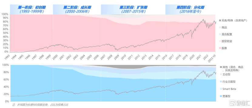 美國(guó)ETF市場(chǎng)起源于1993年,經(jīng)歷30年的發(fā)展,大致經(jīng)歷了初創(chuàng)、成長(zhǎng)、擴(kuò)張和分化四個(gè)階段,ETF規(guī)模占非貨幣基金的比重從不及1%一路攀升至接近30%,是美國(guó)基金市場(chǎng)最重要的投資工具之一。