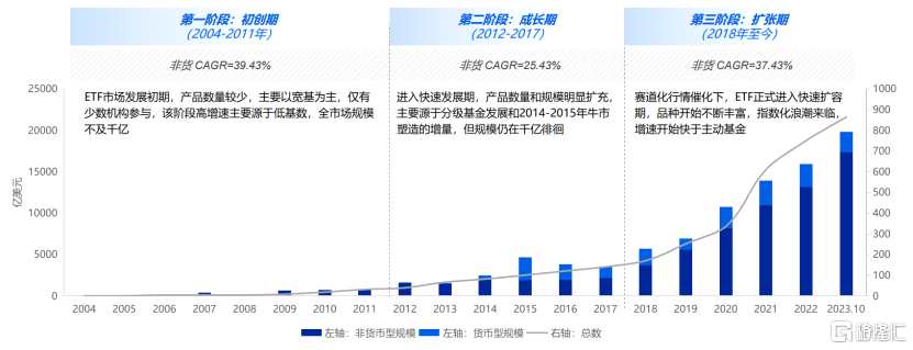 以美國(guó)ETF市場(chǎng)變遷為參考,同樣可以將我國(guó)的ETF市場(chǎng)發(fā)展大致分為三個(gè)階段。我國(guó)已經(jīng)經(jīng)歷初創(chuàng)期和成長(zhǎng)期,目前已進(jìn)入ETF市場(chǎng)的擴(kuò)張期,年化復(fù)合增速高于成長(zhǎng)期增速。