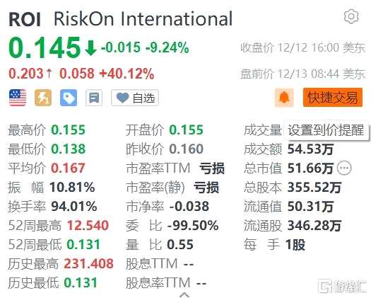 RiskOn International(ROI.US)美股盤前暴漲逾40%,報(bào)0.145美元。根據(jù)美國證券交易委員會(SEC)12月12日披露的文件,RiskOn International股東AULT MILTON C III于12月8日、11日以每股平均價(jià)0.1554美元增持10.45萬股普通股股份,價(jià)值約為1.62萬美元。