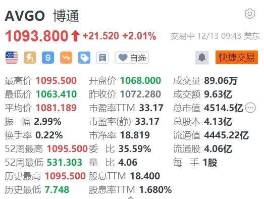 博通漲超2% 股價續(xù)創(chuàng)歷史新高