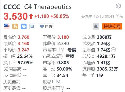C4 Therapeutics(CCCC.US)暴漲超50%,報3.53美元。該股周二暴漲超98%,C4 Therapeutics(C4T)宣布,與默沙東簽署獨家許可和合作協(xié)議,以開發(fā)抗體偶聯(lián)蛋白降解藥物(DACs),這是一種旨在選擇性靶向并降解癌細(xì)胞中引起疾病的蛋白質(zhì)的新興治療模式。根據(jù)協(xié)議條款,C4T將收到1000萬美元的預(yù)付款。如果默沙東行使其所有擴(kuò)展合作的選擇,C4T有資格在整個合作中獲得高達(dá)約25億美元的潛在付款。