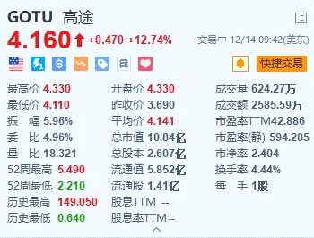 摘要: 來源:互聯(lián)網(wǎng)高途(GOTU.US)漲12.74%,報(bào)4.16美元。消息面上,12日、13日,隨著“小作文”風(fēng)波進(jìn)一步發(fā)酵,高途佳品直播間熱度繼續(xù)暴漲。12月13日晚,
