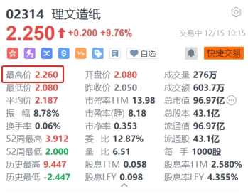 摘要: 來源:互聯(lián)網(wǎng)理文造紙(2314.HK)一度大漲超10%,最高觸及2.26港元。理文造紙于2023年12月14日斥資約154萬港元回購75.7萬股,每股回購價(jià)為2.02-2.04港元。