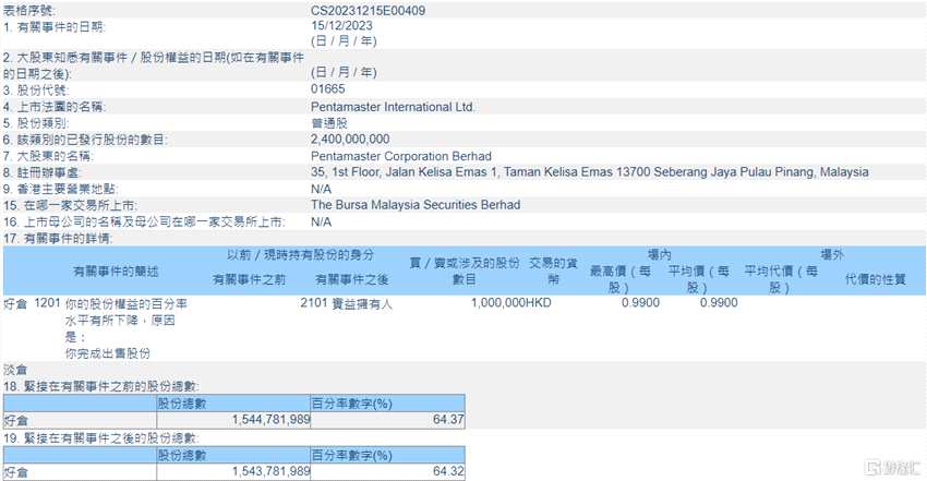 減持后,Pentamaster Corporation Berhad最新持股數(shù)目為1,543,781,989股,持股比例由64.37%下降至64.32%。