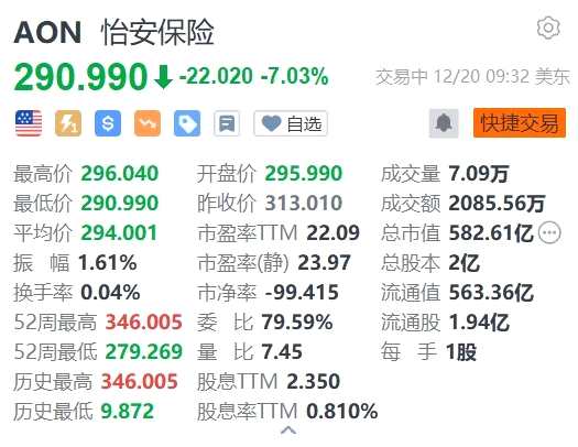 摘要: 來源:互聯(lián)網(wǎng)怡安保險(AON.US)跌超7%,報290.99美元。消息面上,怡安保險將收購保險經(jīng)紀公司NFP,交易價值為134億美元,以拓展快速增長的中端市場,涉及風(fēng)險、福利、財富和退休計劃咨詢等領(lǐng)域
