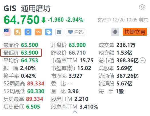通用磨坊(GIS.US)盤初一度跌超4%,最低觸及63.9美元。通用磨坊2024財年Q2銷售額為51.4億美元,同比下降1.57%,低于市場普遍預期的53.5億美元;調整后每股收益為1.25美元,市場預期為1.16美元。