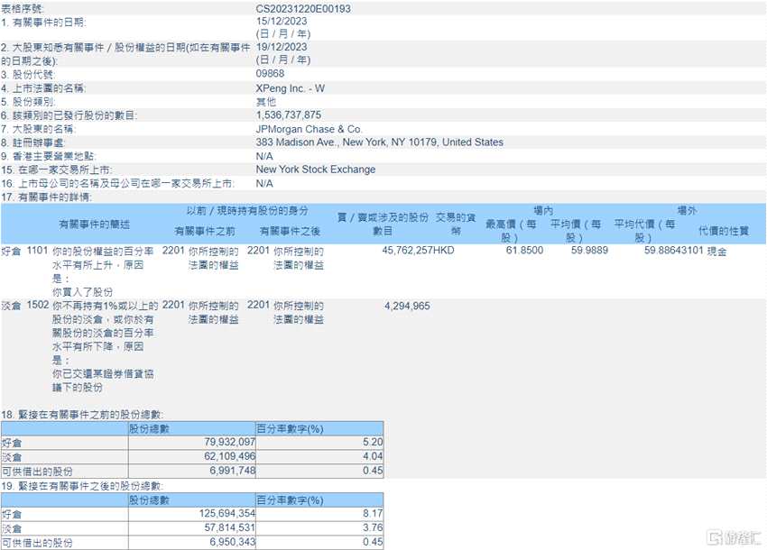 摘要: 來源:互聯(lián)網(wǎng)互聯(lián)網(wǎng)12月21日丨根據(jù)聯(lián)交所最新權(quán)益披露資料顯示,2023年12月15日,小鵬汽車-W(09868.HK)獲JPMorganChase&Co.以每股均價59.9889港元增持好倉4576