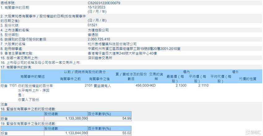 摘要: 來源:互聯(lián)網(wǎng)互聯(lián)網(wǎng)12月21日丨根據(jù)聯(lián)交所最新權益披露資料顯示,2023年12月15日,方達控股(01521.HK)獲杭州泰格醫(yī)藥科技股份有限公司在場內以每股均價2.111港元增持45.6萬股,