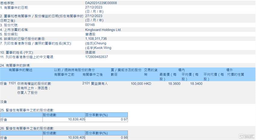 摘要: 來源:互聯(lián)網(wǎng)互聯(lián)網(wǎng)1月2日丨根據(jù)聯(lián)交所最新權(quán)益披露資料顯示,2023年12月27日,建滔集團(tuán)(00148.HK)獲執(zhí)行董事張國(guó)榮在場(chǎng)內(nèi)以每股均價(jià)18.34港元增持10萬股,涉資約183.4萬港元。