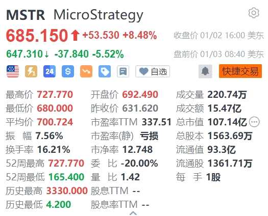 美股異動 | 軟件公司MicroStrategy盤前跌5.52% 比特幣大鱷出售該公司價值近2.16億美元股票