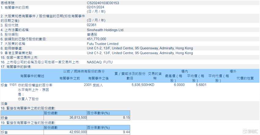 中康控股(02361.HK)獲Futu Trustee Limited增持583.65萬股