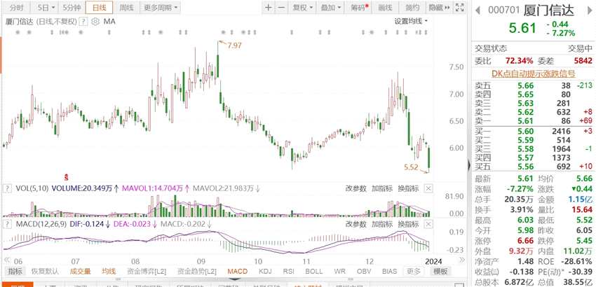 摘要: 來源:互聯(lián)網(wǎng)廈門信達(dá)(000701.SZ)跌逾7%,報(bào)5.61元,創(chuàng)2022年11月以來新低,總市值38.55億元。1月3日,廈門信達(dá)發(fā)布向特定對象發(fā)行股票解除限售上市流通的提示性公告,