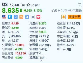 QuantumScape跌超7% 周四因其固態(tài)電池耐力測(cè)試結(jié)果積極暴漲超43%