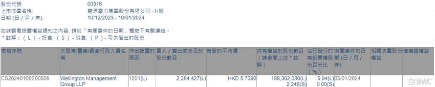 龍?jiān)措娏?00916.HK)遭Wellington Management Group LLP減持238.44萬(wàn)股