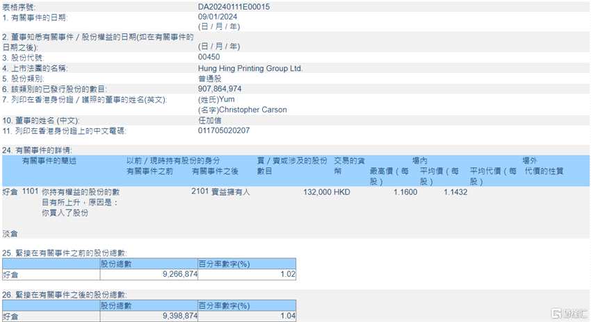 鴻興印刷集團(00450.HK)獲執(zhí)行董事任加信增持13.2萬股