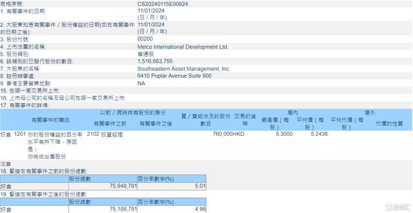 摘要: 來(lái)源:互聯(lián)網(wǎng)互聯(lián)網(wǎng)1月17日丨根據(jù)聯(lián)交所最新權(quán)益披露資料顯示,2024年1月11日,新濠國(guó)際發(fā)展(00200.HK)遭SoutheasternAssetManagement,Inc.在場(chǎng)內(nèi)以每股均價(jià)5