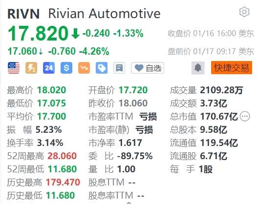 美股異動丨Rivian盤前跌4.26% 遭德意志銀行下調(diào)評級