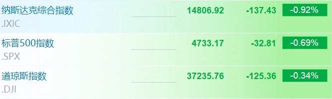 美股三大指數(shù)低開,納指跌0.92%,標普500指數(shù)跌0.69%,道指跌0.34%。