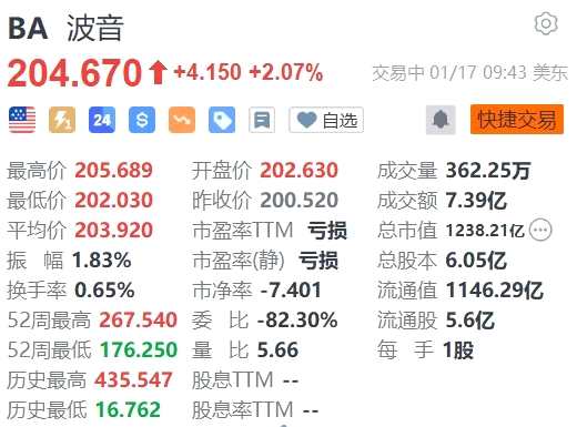 波音漲2.07% FAA稱已完成對波音737 MAX 9飛機進行的前40次檢查