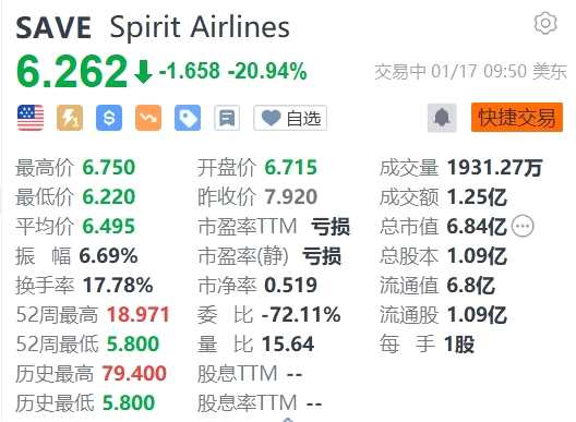 昨日大幅收跌47.09%的Spirit Airlines(SAVE.US)續(xù)跌近21%,報(bào)6.262美元。消息面上,美國(guó)一名聯(lián)邦法官William G. Young阻止捷藍(lán)航空收購(gòu)廉航競(jìng)爭(zhēng)對(duì)手精神航空,他于周二裁定永久禁止這項(xiàng)計(jì)劃中的交易。