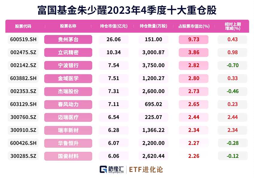 朱少醒最新管理規(guī)模283.4億,旗下所管產(chǎn)品重倉股信息披露,2023年4季度前十大重倉股新進邁瑞醫(yī)療、瑞豐新材,增持貴州茅臺、立訊精密、金域醫(yī)學、春風動力、國瓷材料。