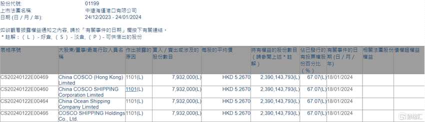 互聯(lián)網(wǎng)1月24日丨根據(jù)聯(lián)交所最新權(quán)益披露資料顯示,2024年1月18日,中遠(yuǎn)海運(yùn)港口(01199.HK)獲中遠(yuǎn)??卦趫鰞?nèi)以每股均價(jià)5.267港元增持793.2萬股,涉資約4177.78萬港元。