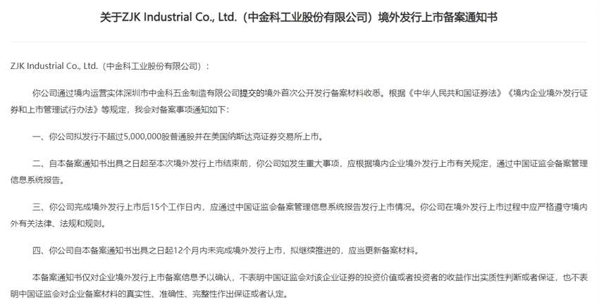 1月24日,中國證監(jiān)會國際合作部發(fā)布關于ZJK Industrial Co., Ltd.(中金科工業(yè)股份有限公司)境外發(fā)行上市備案通知書,該公司擬發(fā)行不超過500萬股普通股并在美國納斯達克證券交易所上市。