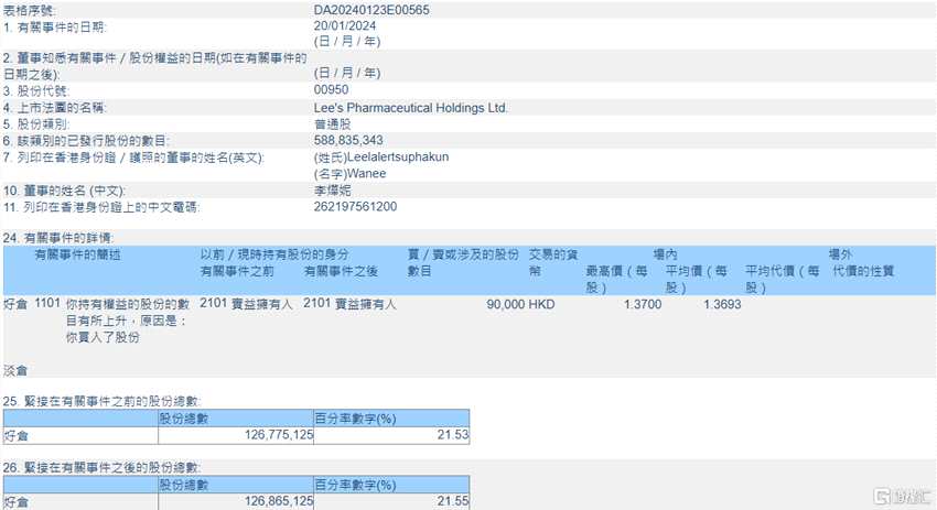 互聯(lián)網(wǎng)1月25日丨根據(jù)聯(lián)交所最新權(quán)益披露資料顯示,2024年1月20日,李氏大藥廠(00950.HK)獲執(zhí)行董事李燁妮在場內(nèi)以每股均價(jià)1.3693港元增持9萬股,涉資約12.32萬港元。