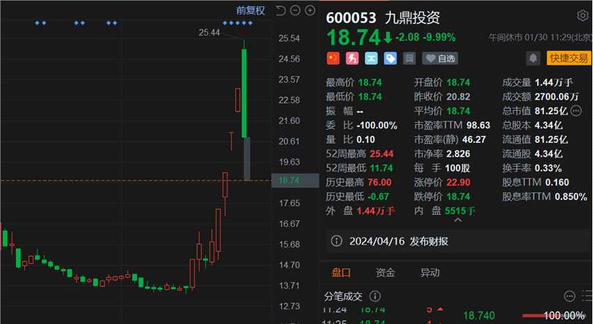 摘要: 炒股就看分析師研報,權威,專業(yè),及時,全面,助您挖掘潛力主題機會!來源:互聯(lián)網(wǎng)昨日上演“天地板”的九鼎投資(600053.SH)再度跌停,現(xiàn)報18.74元,總市值81億元。