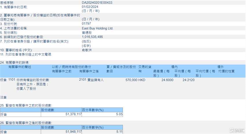 互聯(lián)網(wǎng)2月5日丨根據(jù)聯(lián)交所最新權(quán)益披露資料顯示,2024年2月1日,東方甄選(01797.HK)獲執(zhí)行董事兼主席俞敏洪在場(chǎng)內(nèi)以每股均價(jià)24.212港元增持57萬(wàn)股,涉資約1380.08萬(wàn)港元。
