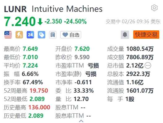 太空探索初創(chuàng)公司“直覺機器”(Intuitive Machines)(LUNR.US)大跌24.5%報7.24美元,該股上周五收漲15.82%。