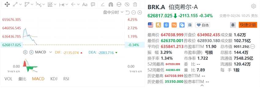 美股異動 | 伯克希爾-A由漲轉跌 盤前一度漲5%