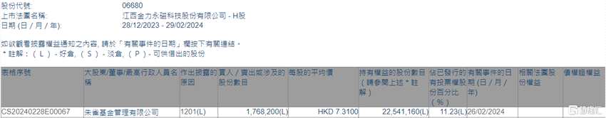 互聯(lián)網(wǎng)2月29日丨根據(jù)聯(lián)交所最新權(quán)益披露資料顯示,2024年2月26日,金力永磁(06680.HK)遭朱雀基金管理有限公司在場(chǎng)內(nèi)以每股均價(jià)7.31港元減持176.82萬(wàn)股,涉資約1292.55萬(wàn)港元。