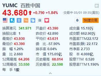 百勝中國漲1.84% 去年每股攤薄盈利增長89%